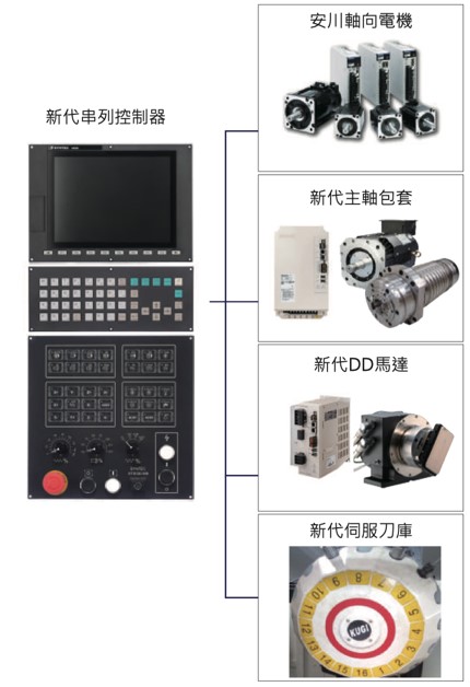 21系列高速高精控制器 -安川高解析度控制器(24bit)-轴向光学尺(选配)-新代高解析度主轴电机包套-新代DD第四轴、第五轴-中心出水主轴电机(选配)-高速主轴定位-高速刚性攻牙-高速高精功能(HPCC)统的弹性与可靠度。